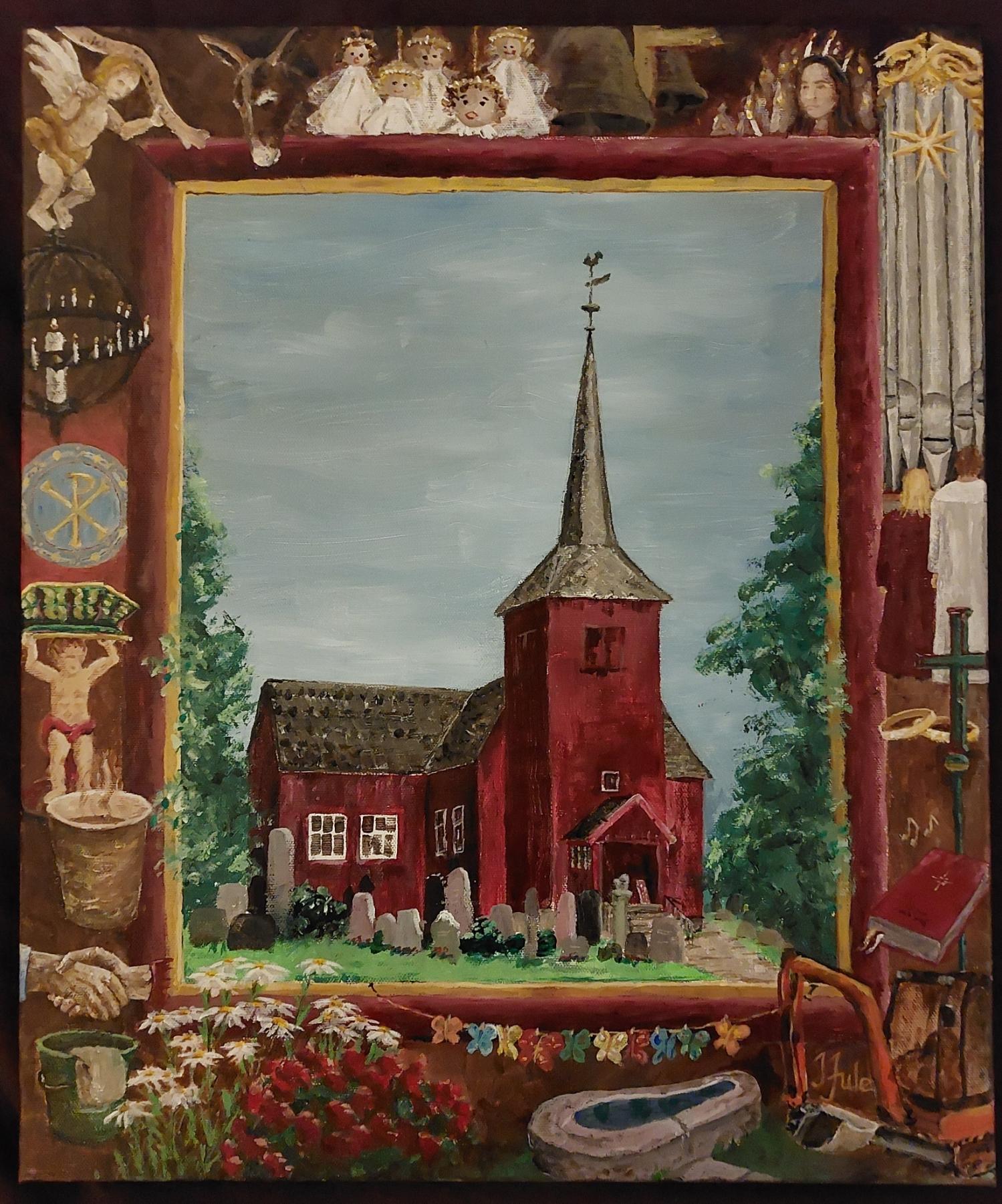Under finnes malerier av Nidarosdomen, samt kirkene Mære, Elverum og Hernes. På ramma rundt hvert kirkebygg er det malt motiver fra kirka sin historie, inventar, aktiviteter og symboler de tingene som gjør bygget til kirke i folks liv.